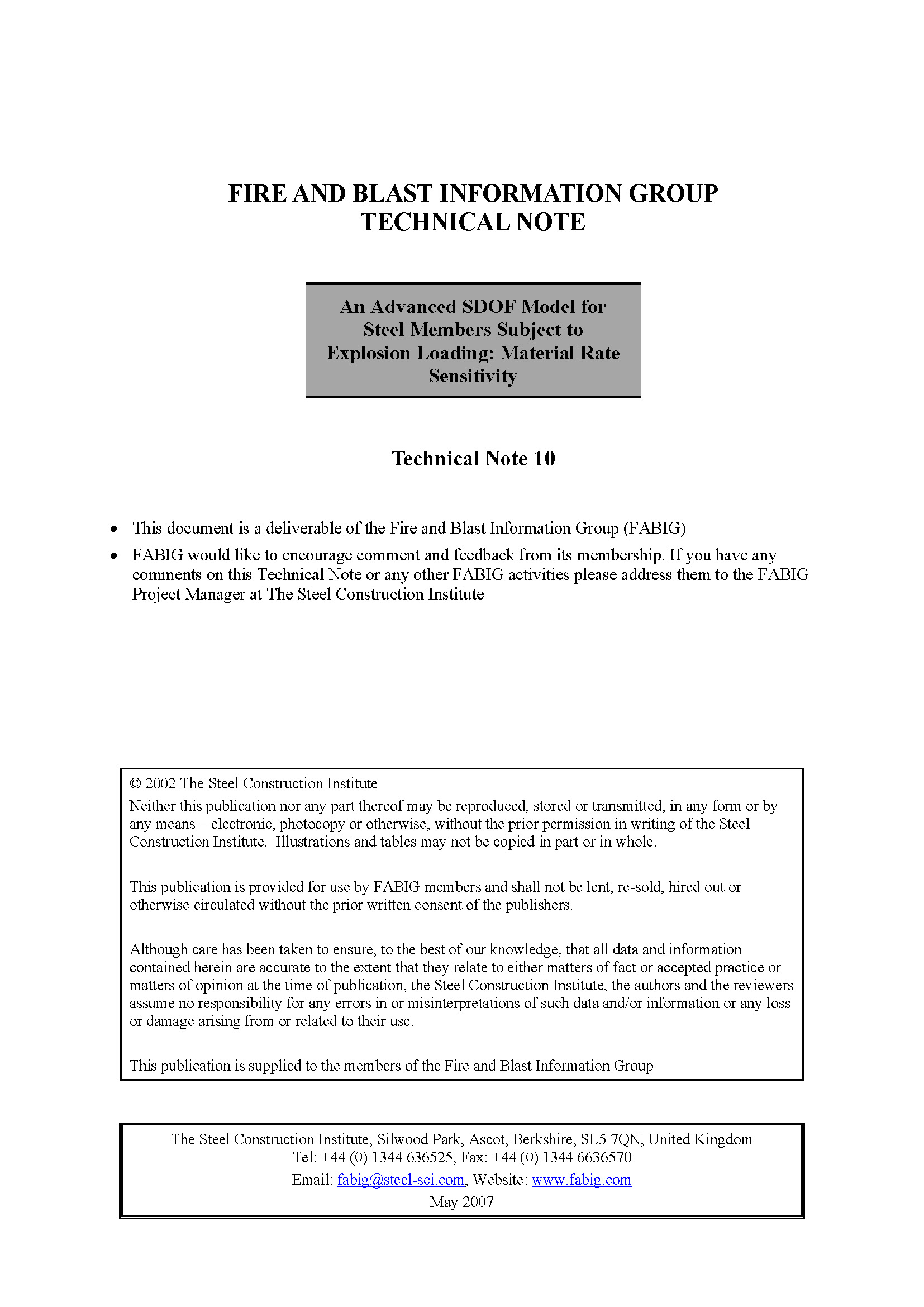 The Technical Note proceeds by providing an overview of the problem characteristics as well as the formulation method used in developing the new SDOF model, where consideration is given to material rate sensitivity in accordance with the Cowper-Symonds model. The details of the overall model are then provided, mainly in the form of parametric tables, covering both the bending and catenary stages of the plastic rate-sensitive member response. Finally, several verification and application examples are provided, with particular emphasis given to the new developments, where comparisons are made against the nonlinear finite element analysis program ADAPTIC. These examples demonstrate the calculation process involved in applying the new SDOF model, and illustrate the very good accuracy which the new model achieves.